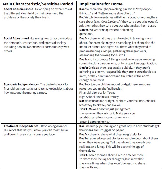 This article will give you a general idea of the characteristics of youth ages 12 – 18 and their “sensitive periods,” along with thoughts about what you, as a parent, can do to support them at home.
